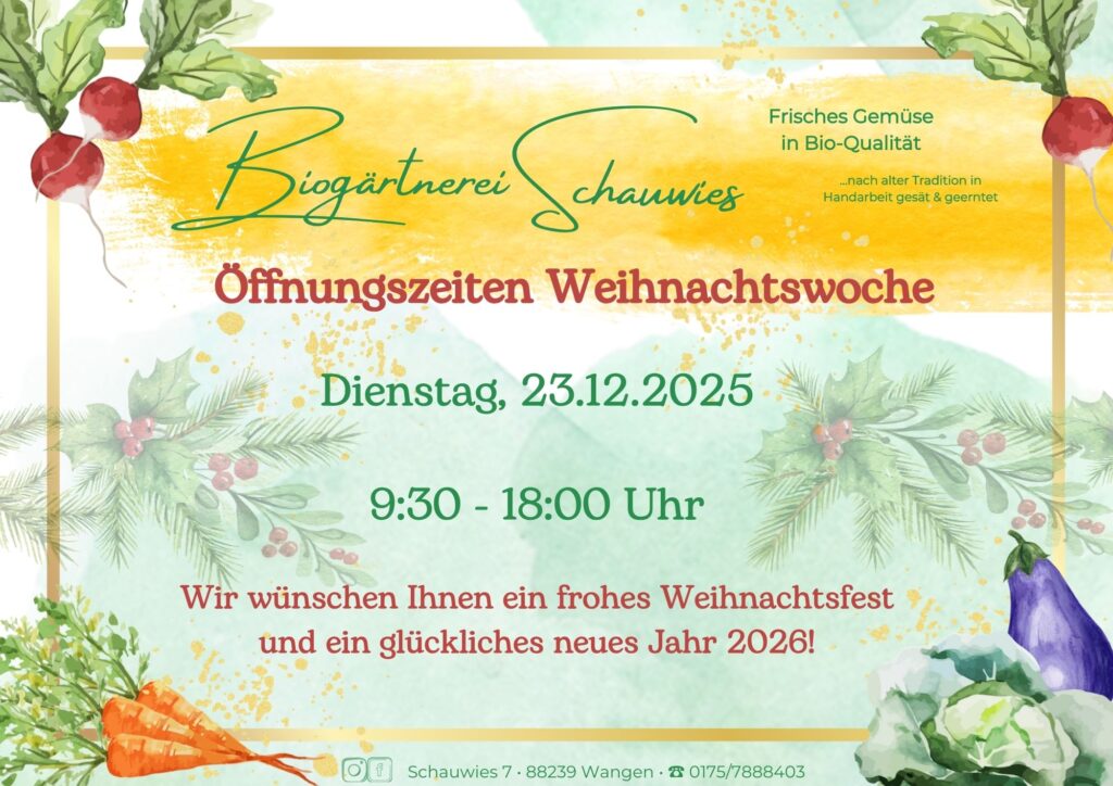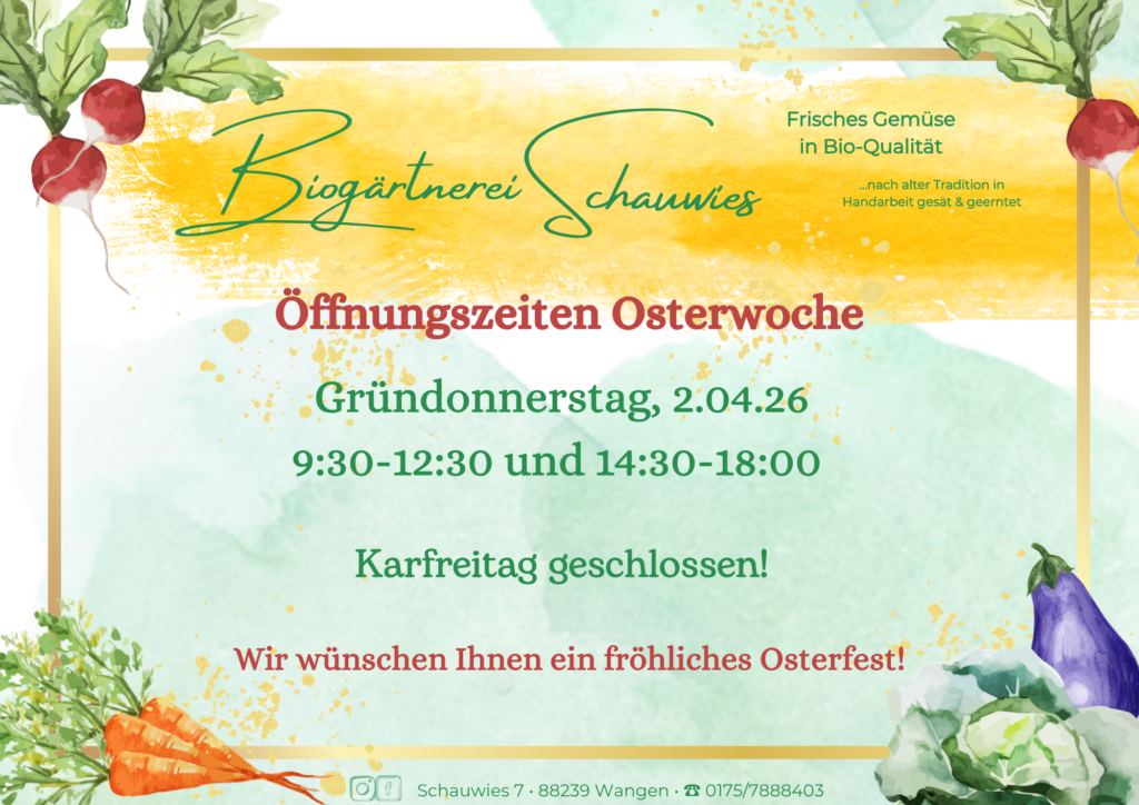 Wir sind stolz darauf, was uns unsere Felder jedes Jahr für gesundes und hochwertiges Gemüse schenken. Daher verzichten wir gänzlich darauf, nicht saisonale Produkte zuzukaufen und sind dankbar für die Fülle, die wir haben.